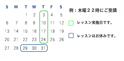 毎月の第5週はレッスンが実施されません。第5週にレッスンをご希望の際は、追加代金にてご追加いただけます。